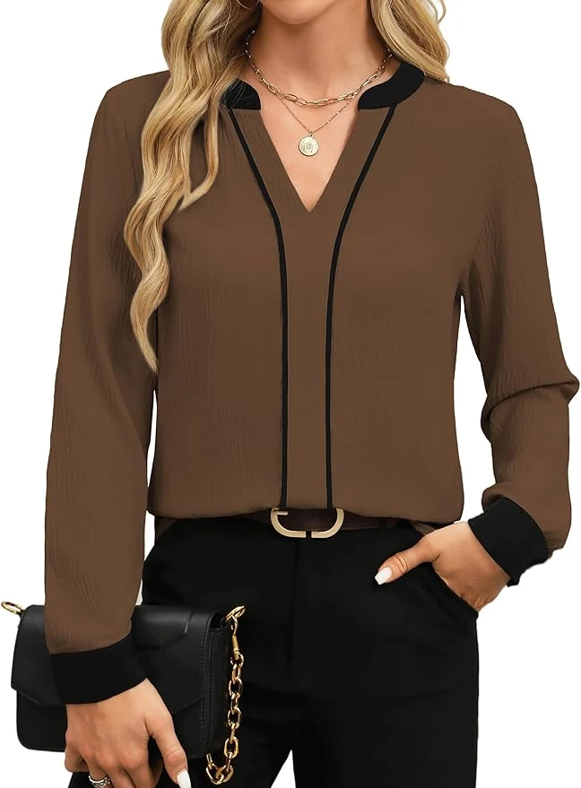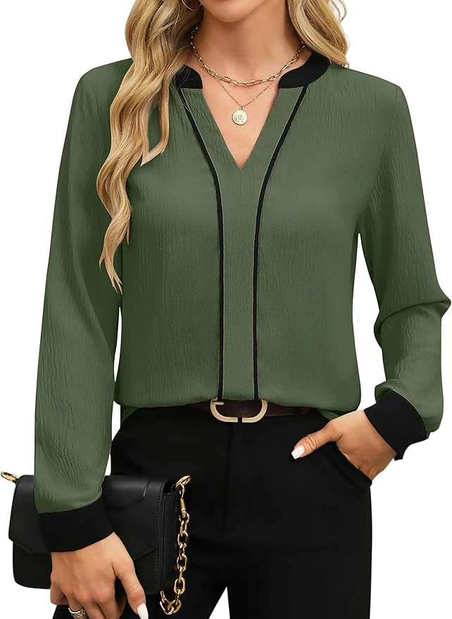 - Design: The womens tops dressy casual feature a notched neck and two-tone color block design. Color block design helps elongate body curve and break the dullness of traditional work shirts, adding a touch of personality to your outfit. While the Contrast Binding detail gives it a fashion and professional look. The V-neck adds a touch of casual yet chic style to your ensemble.